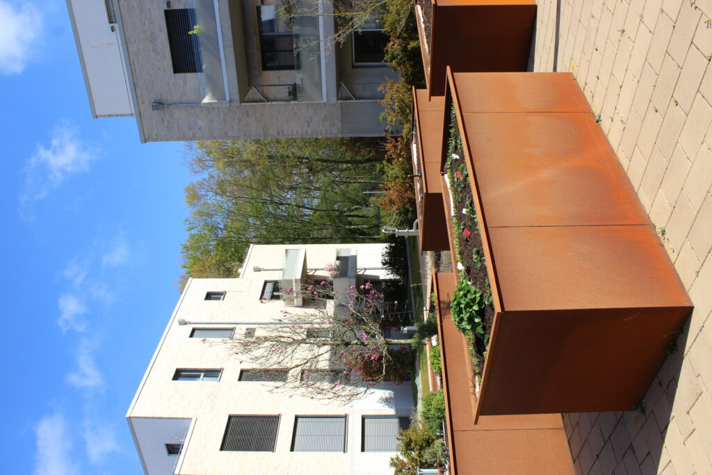 Alles wird grün – dank der Gemeinschaft des Wohnpark Spyck. Zwischen den vier Häusern der Klimaschutzsiedlung liegt die “grüne Mitte”- das Herzstück des Quartiers. Neben dem Wasserspiel und einem Boule-Platz..