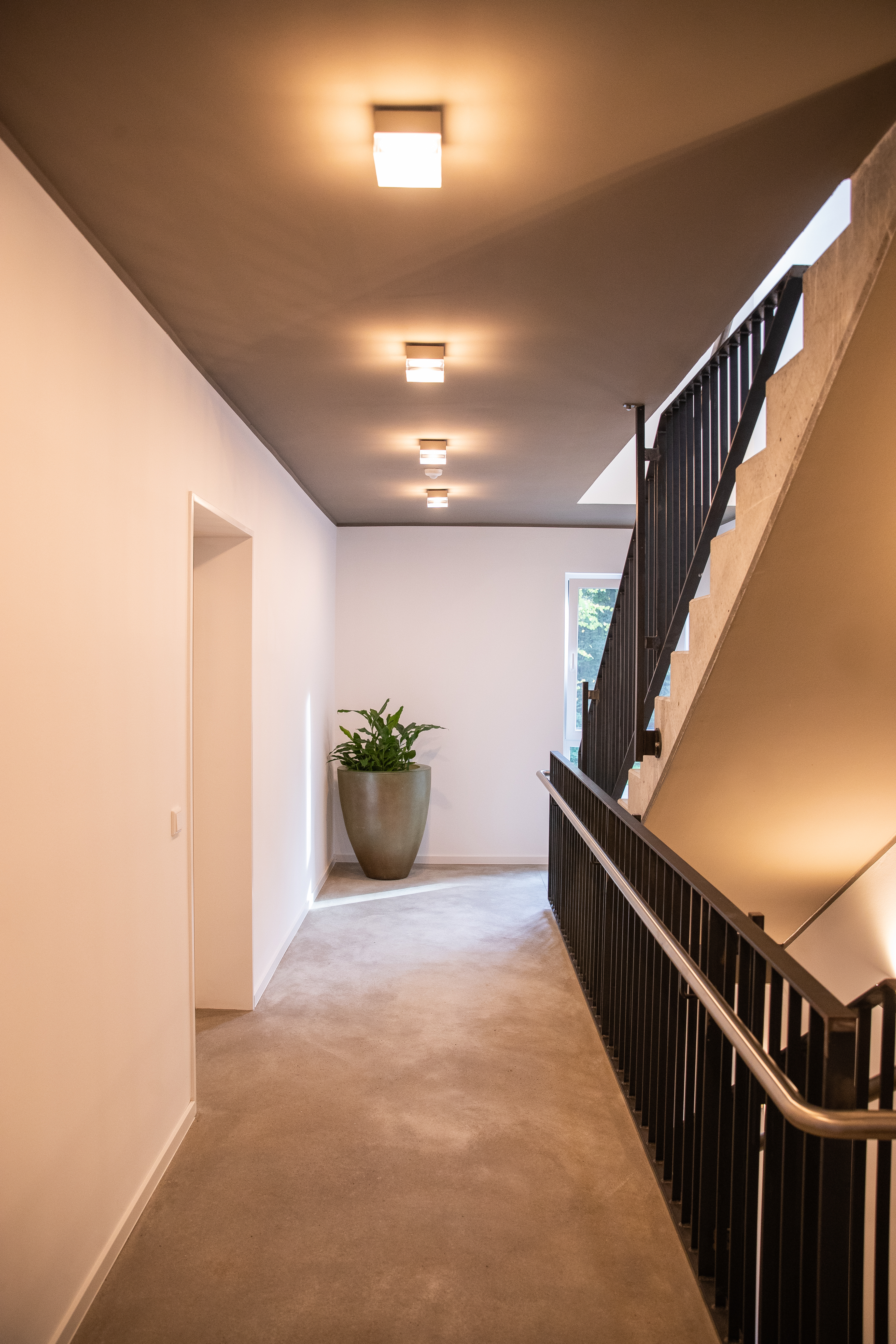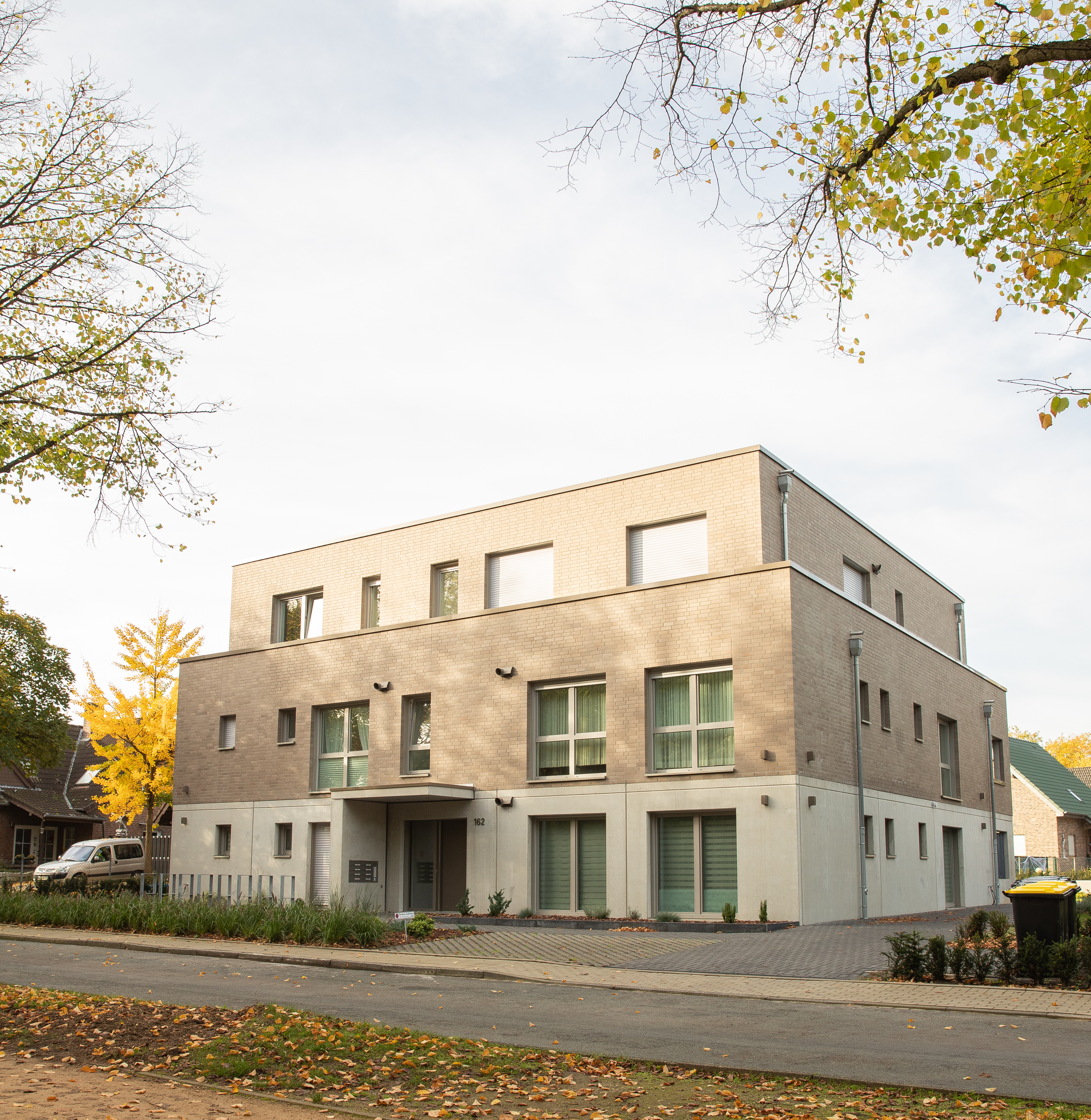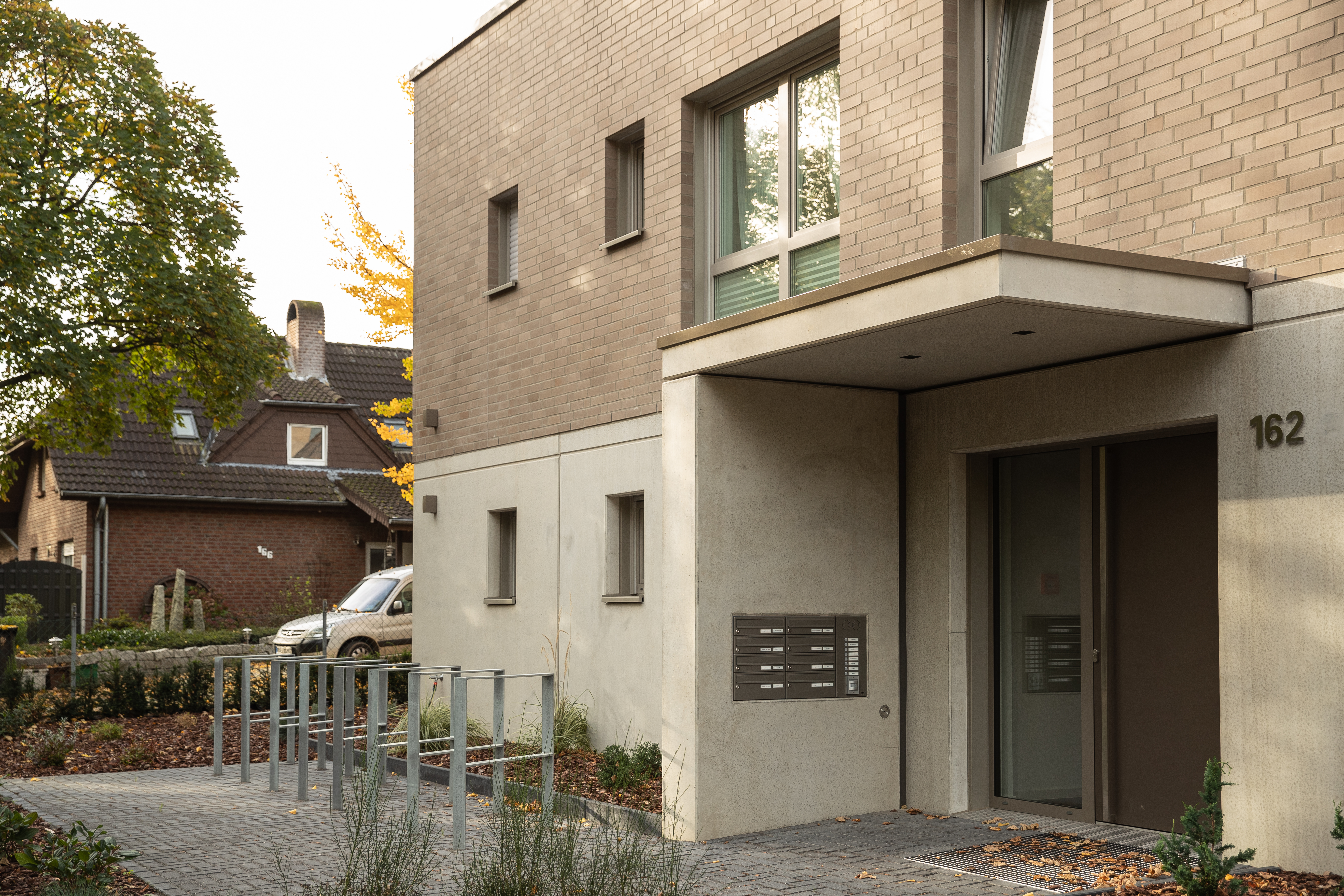 In zentraler Lage in Kleve bietet das Mehrfamilienhaus Wohnraum für acht Parteien. Das Zusammenspiel aus braunem Strangpressziegel, platinfarbenen Fenstern sowie den Sichtbeton-Fertigteilen überzeugt auf der einen Seite durch seine Schlichtheit, auf der anderen Seite durch die harmonisch aufeinander abgestimmten Materialien. Das Flachdach mit extensiver Dachbegrünung verbessert das Mikroklima und steigert zugleich die Biodiversität in der waldnahen Umgebung. Eine Photovoltaikanlage sichert solare Gewinne und die Sole-Wasser-Wärmepumpe dient der Wärmeversorgung. Durch den Einsatz einer dezentralen Lüftungsanlage kann ein angenehmes Raumklima erreicht werden.